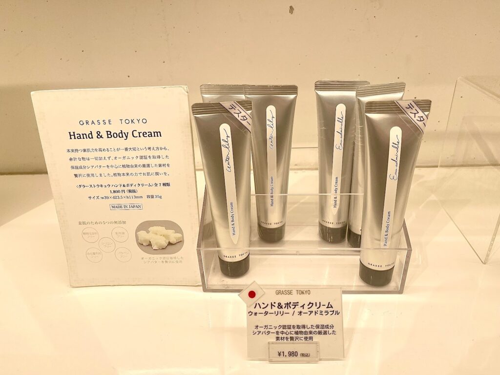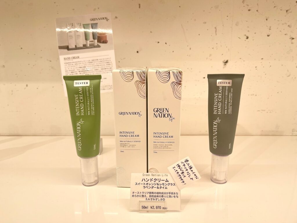 サニーゴ店内ではGrasse Tokyoと、Green Nationのハンドクリームを実際に試せます。