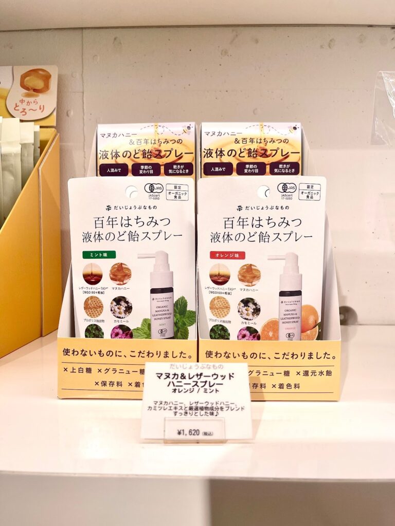 マヌカハニー、レザーウッドハニーとカミツレエキスを配合しており、百年はちみつのど飴と同じようにオーガニック成分と、使わないものにこだわっています。